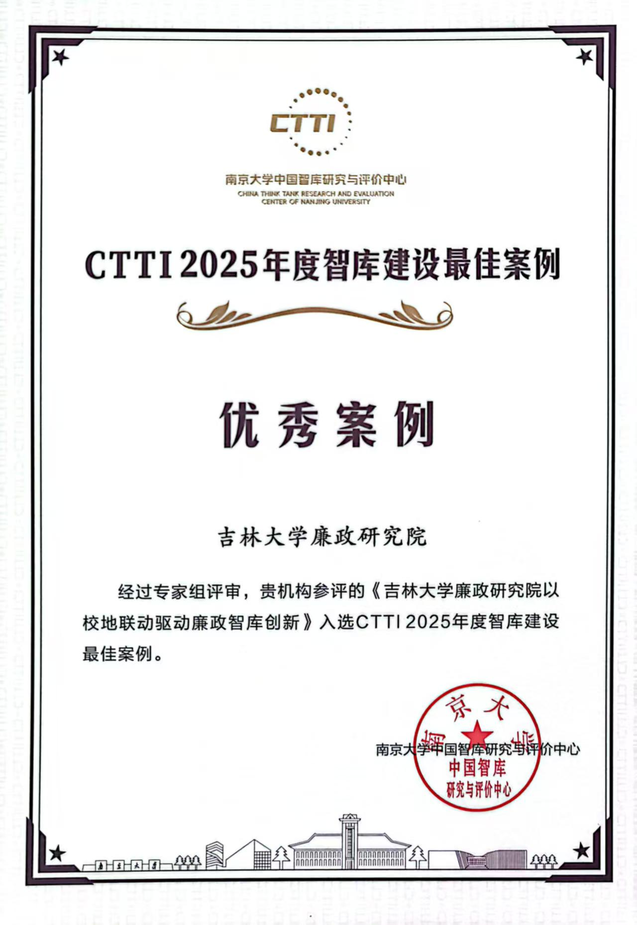 作为国内智库评价领域的重要标杆,CTTI(中国智库索引)由南京大学中国智库研究与评价中心牵头构建,其年度最佳案例评选聚焦智库建设的创新实践与示范价值,重点考察智库在资源整合、机制创新、服务效能等方面的突破性成果,评选结果已成为衡量我国智库建设质量的重要参考。此次吉林大学廉政研究院的入选案例,以“校地联动”为核心特色,系统展现了高校智库立足学术根基、对接实践需求的创新发展路径,为纪检监察人才培养和同类智库建设提供了重要参考。