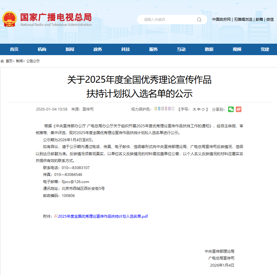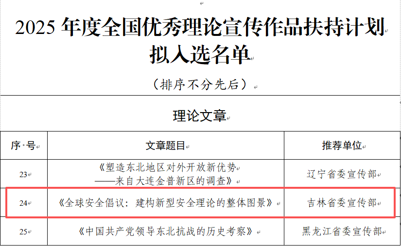 2026年1月19日,中央宣传部办公厅、广电总局办公厅公布了关于2025年度全国优秀理论宣传作品扶持计划入选名单,我校刘雪莲教授的《全球安全倡议:建构新型安全理论的整体图景》一文成功入选。此次入选的理论文章共50篇,刘雪莲教授的文章由吉林省委宣传部推荐。《全球安全倡议:建构新型安全理论的整体图景》一文于2025年8月26日发表在《人民日报》理论版,是“深入学习贯彻习近平新时代中国特色社会主义思想原创性概念标识性概念纵横谈”的系列文章之一,文章发表后,得到了社会和学界很好的反响,不仅有南方网、中国经济网等多个网络平台转发,而且被《新华文摘》2025年第21期全文转载。此次入选2025年度全国优秀理论宣传作品扶持计划,是对这篇文章的再次肯定。