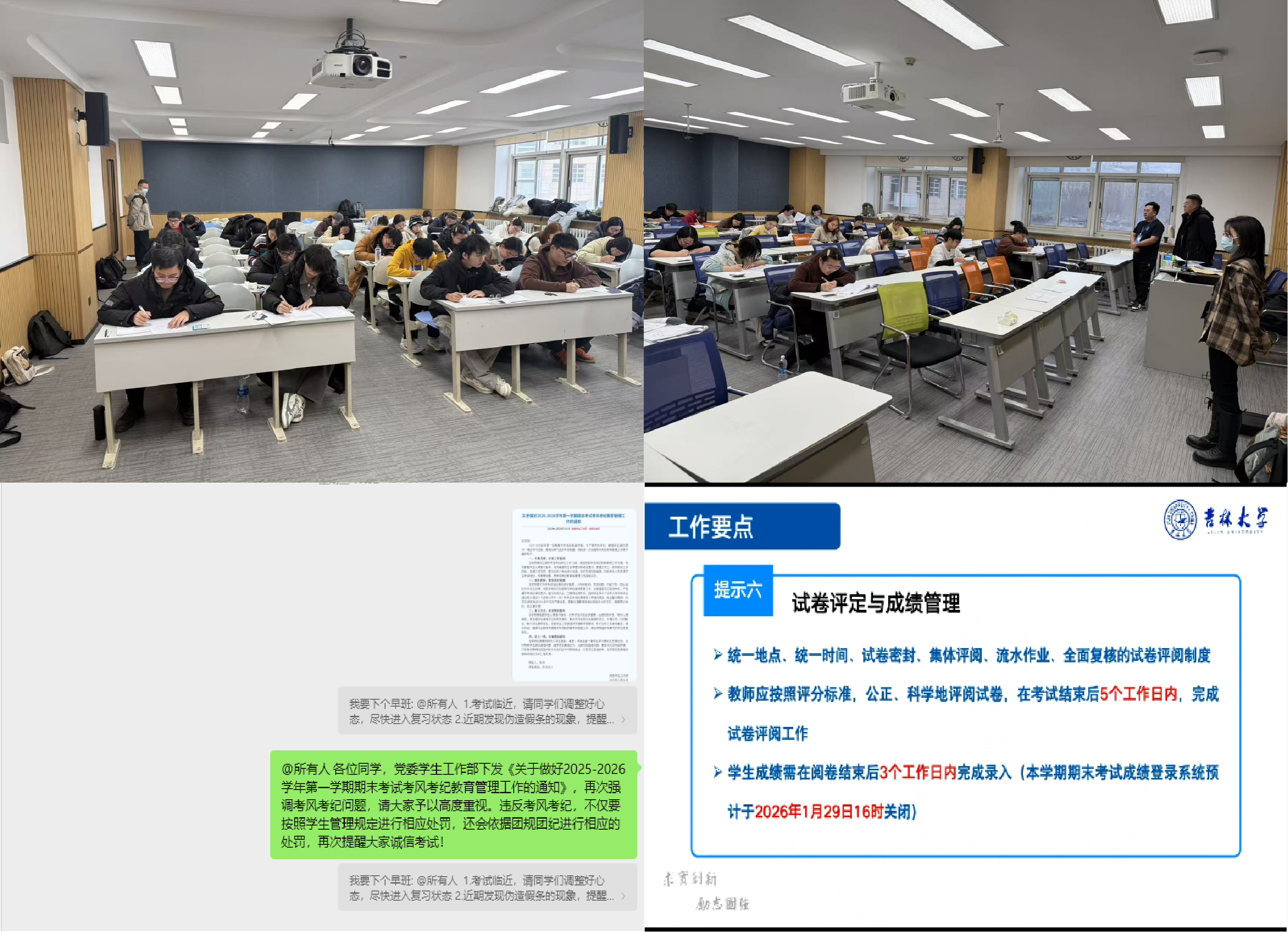 学院按照本科生院和党委学生工作部有关要求,制定《行政学院2025-2026学年第一学期本科生期末考试考风考纪教育管理工作方案》,分别成立院级巡考组暨考风考纪教育管理领导小组。各年级辅导员通过线上线下相结合的方式,开展考试普法宣教和违纪处分案例警示,同时重点针对学业关注对象进行团体辅导和咨询答疑,深入学生宿舍和课堂走访,帮助学生做好心理调适。12月16日,学院召开期末考试考风考纪教育管理工作会议,传达学校关于考试教育管理工作的要求,进一步明确期末考试命题、阅卷等环节的纪律要求,并重点对监考和违纪情形认定及处理等工作强调要求。12月24日,学校召开2025-2026学年第一学期期末考试工作部署会暨考风考纪教育线上会议,全面部署本学期期末考试工作,确保相关工作安全平稳有序开展。考试期间,党委书记、副书记、辅导员等轮流深入考场巡考,检查考试组织秩序,督促考生诚信考试。
