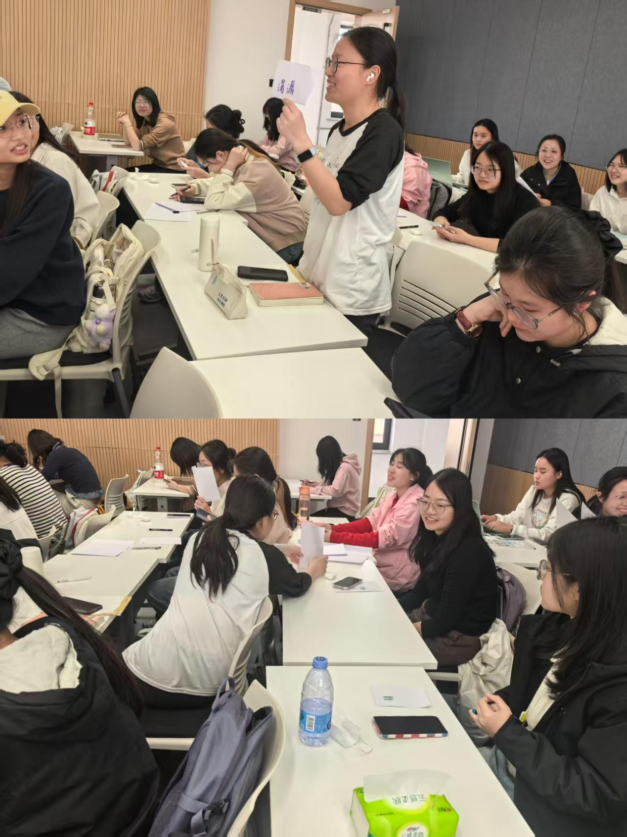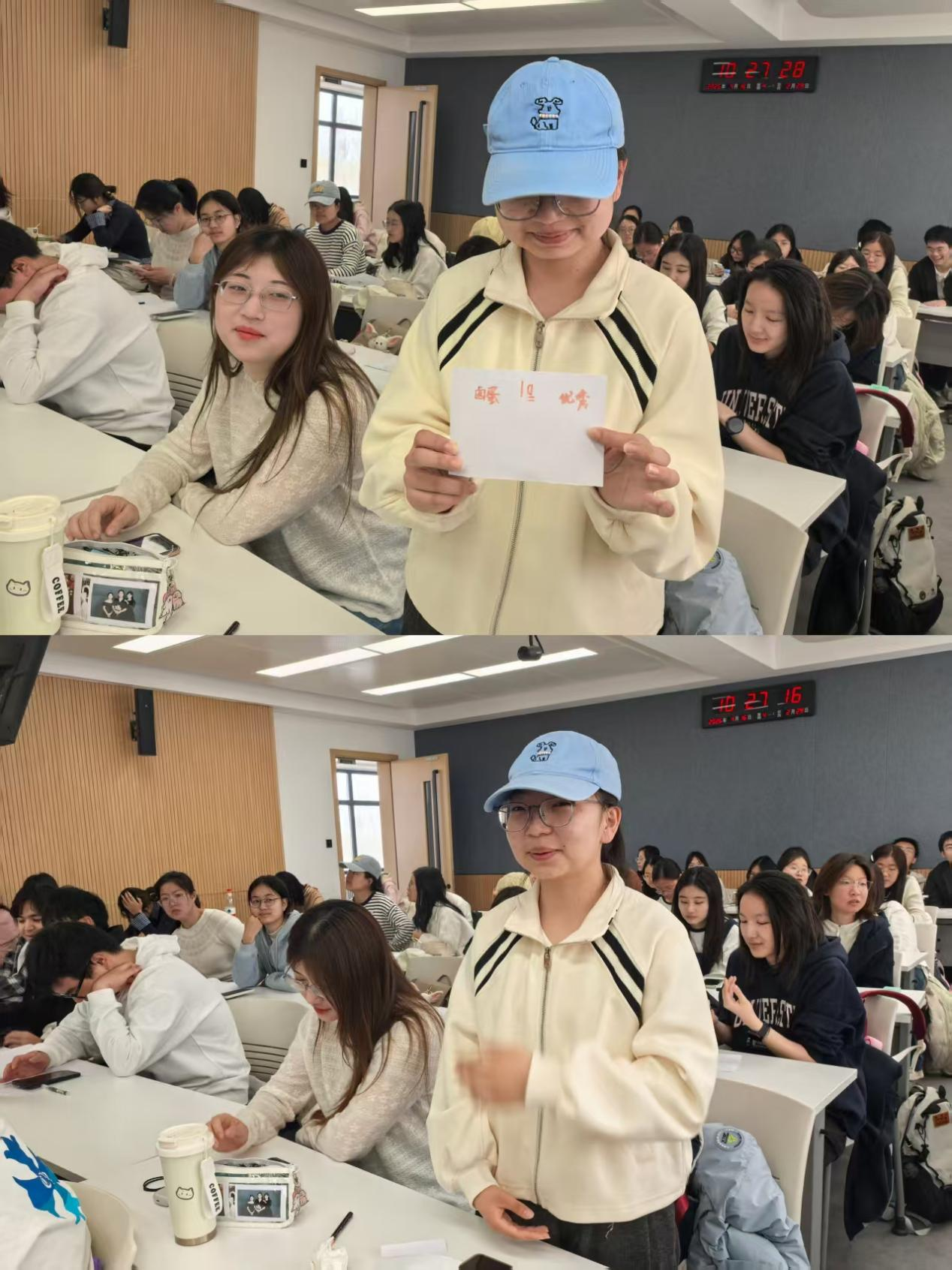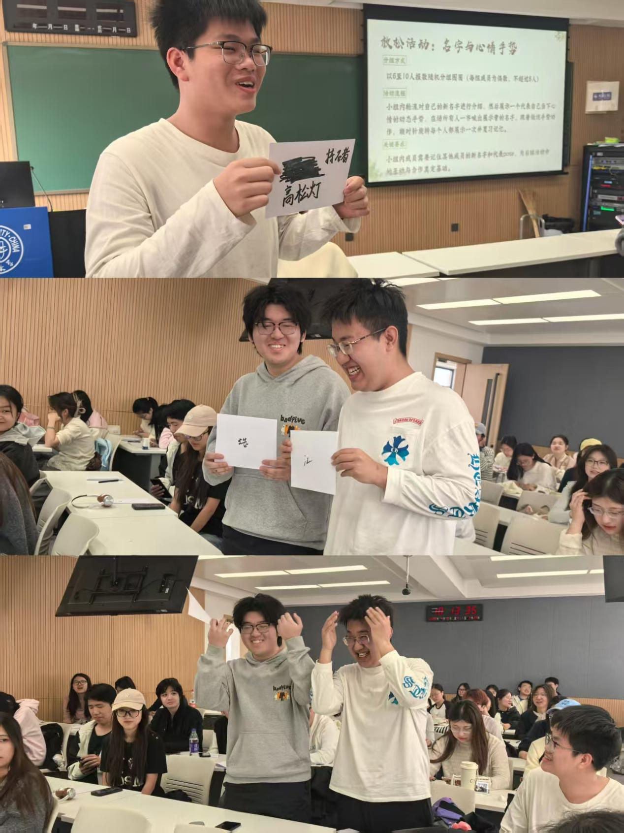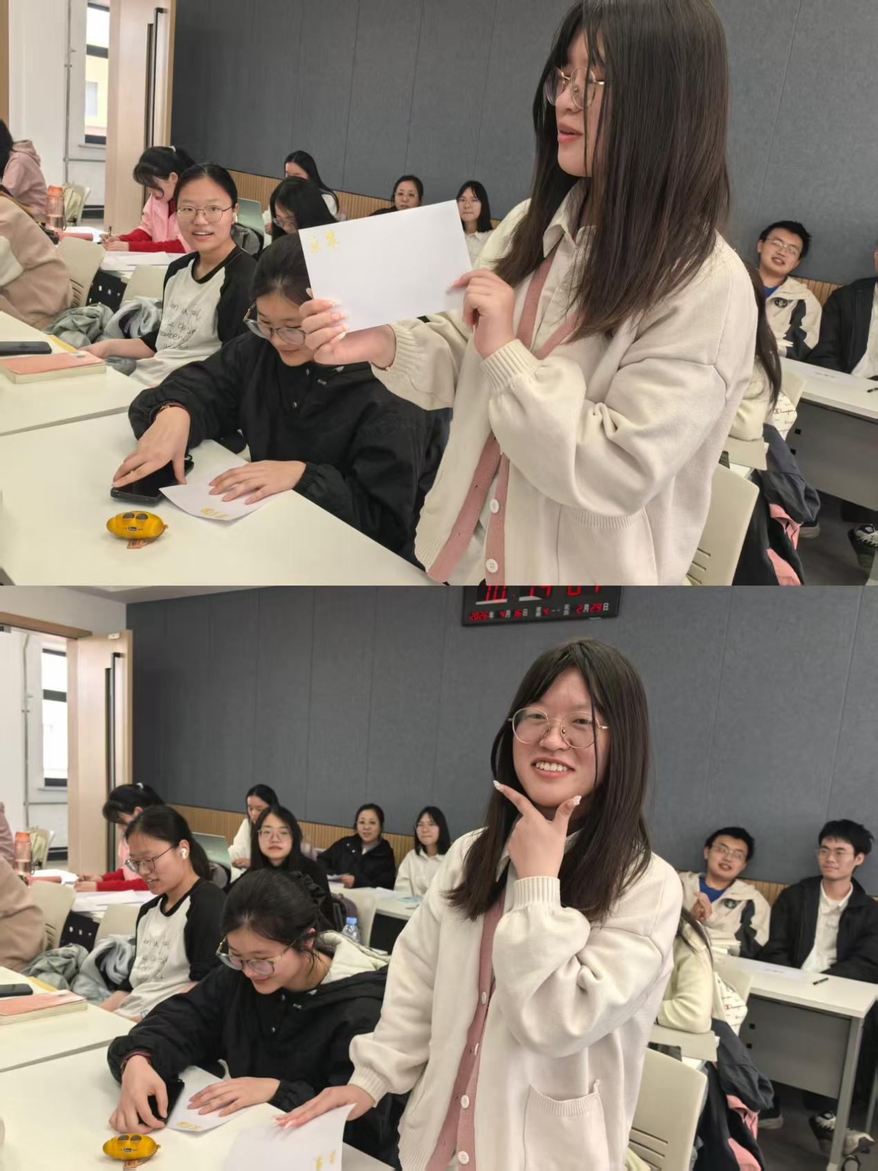 活动以“昵称创建”拉开序幕。每位同学为自己取一个活动中的新名字,并写在白纸上置于显眼位置,以全新的身份投入体验。“名字与心情手势”放松活动中,同学们分组依次介绍自己的昵称并用动态手势表达当下心情,欢声笑语中迅速拉近了彼此距离。班会核心阶段,“韧性温度计”环节,同学们用手势比划出0-10分的心理韧性自评分数,并在小组内分享评分背后的经历与韧性变化的小故事。各组代表总结共性发现,引发强烈的共鸣与思考。“认知重构练习”中,同学们两两配对,通过2-3轮角色互换,亲身体验改变解释风格对提升应对能力的神奇效果。“我的心灵后盾”环节,同学们绘制自己的支持系统图,在四个同心圆中分别写下家人、朋友、老师、心理中心等能提供心理支持的人或组织,并分享后盾所提供的情绪安慰、实际帮助类型,以及主动搭建与维护支持系统的方法,帮助同学们认识到自己并非孤身一人,在困境中主动求助同样是韧性的重要体现。班会尾声,通过“击鼓传花”形式随机邀请多位同学分享感悟,为此次心灵之旅画上了圆满句号。